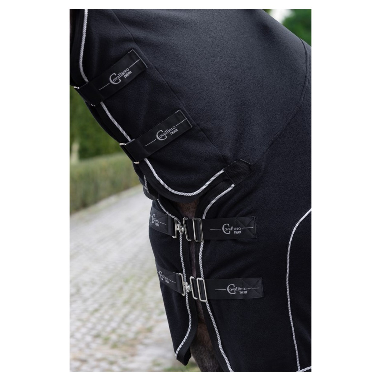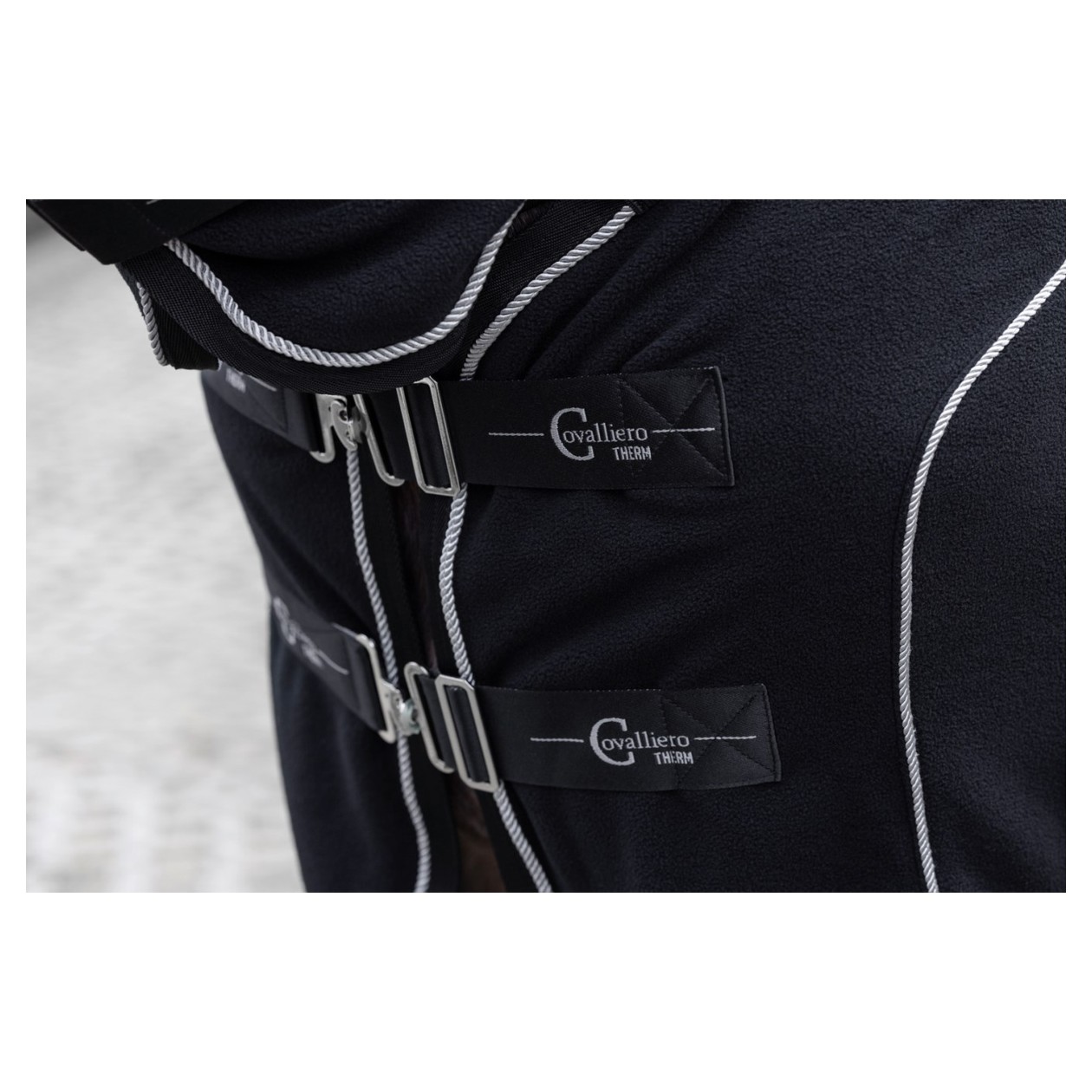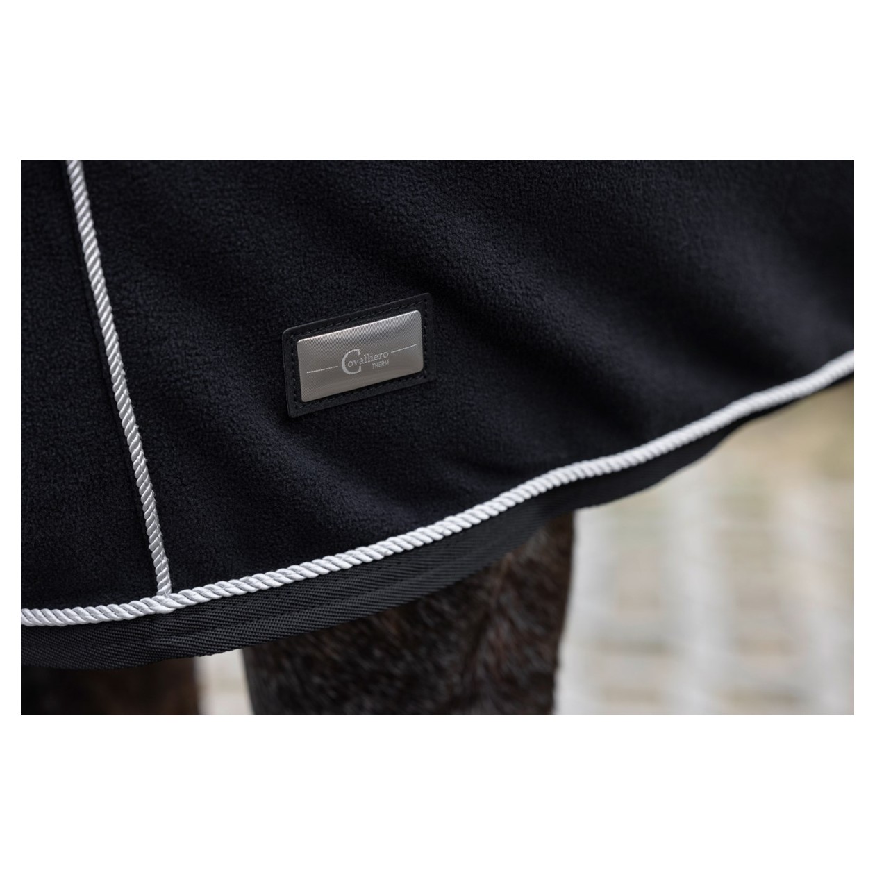 Die flauschigweiche Abschwitzdecke aus innovativem CovallieroTherm Material hat einen passiven Physiotherapie-Effekt. Wärmespeichernde Keramikpartikel im Gewebe fördern die Durchblutung und Muskelregeneration des Pferdes und erhöhen sein Wohlbefinden.