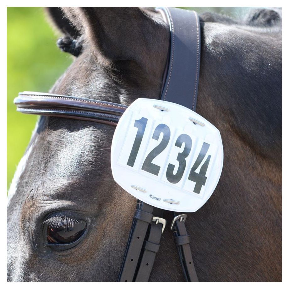Die Startnummer in der Mappe können mit Hilfe von Gummis an die Starter-Schabracke oder an die Trense angebracht werden. Die drei- bzw. vierstelligen Zahlen von 1-999 oder 1-9999 werden eingeschoben, sitzen so sicher und können nicht verrutschen. Vier Gummis sind inklusive, können aber auch im 10er Set nachbestellt werden.